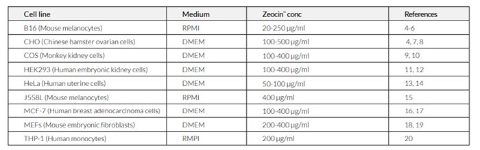 Zeocin?通常以100 μg/ml的濃度使用,即將原液(100 mg/ml in HEPES buffer)稀釋1000倍使用。但也需要根據(jù)您的具體細(xì)胞來(lái)確定最佳濃度。下表列出了在一些哺乳動(dòng)物細(xì)胞篩選實(shí)例中的Zeocin?建議濃度。